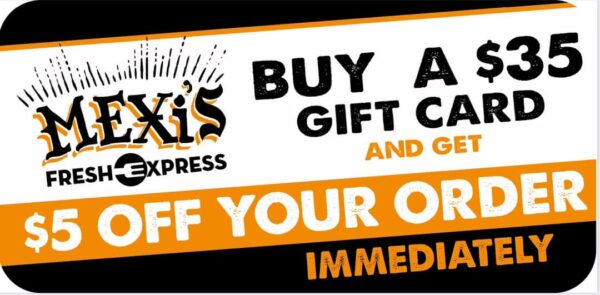 Mexi’s Fresh Express Buy a $35 gift card and receive $5 off your order immediately.