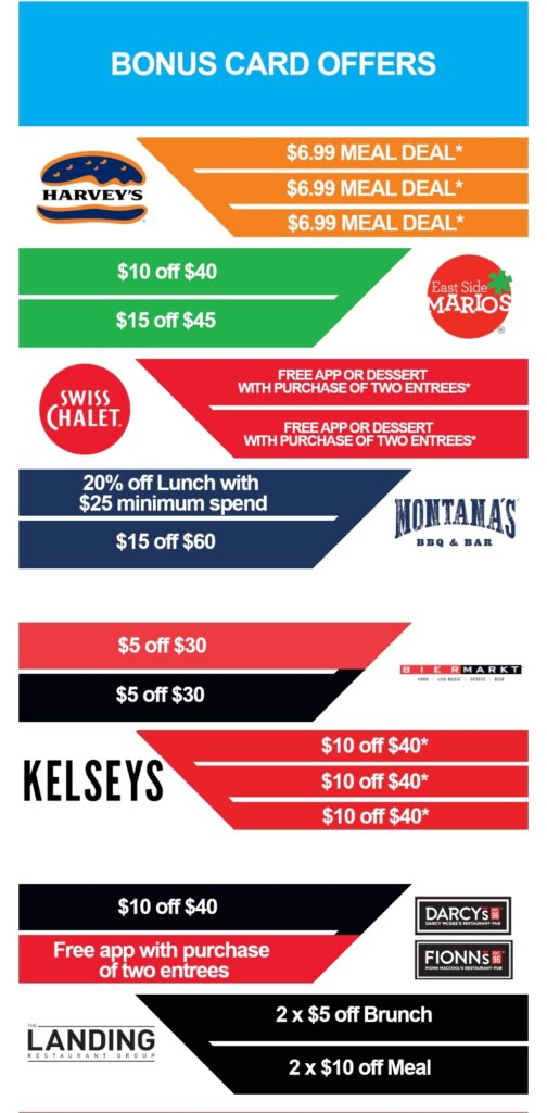 East Side Mario’s, Harvey’s, Kelseys, Swiss Chalet & more – Buy a $50 gift card and receive $175+ bonus offers