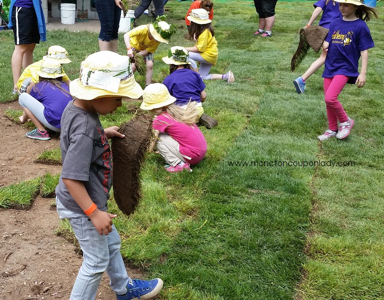 We even had help from the children at Small Blessing Daycare. They brought us lemonade and passed it out. Then they helped us patch up the sod pathway we were filling in, I was working on it when they came over to help pick up the odd pieces of sod around the playground. When they brought it all back, they started puzzle piecing it all together. Hard workers and they were much faster at the job than we adults were 🙂