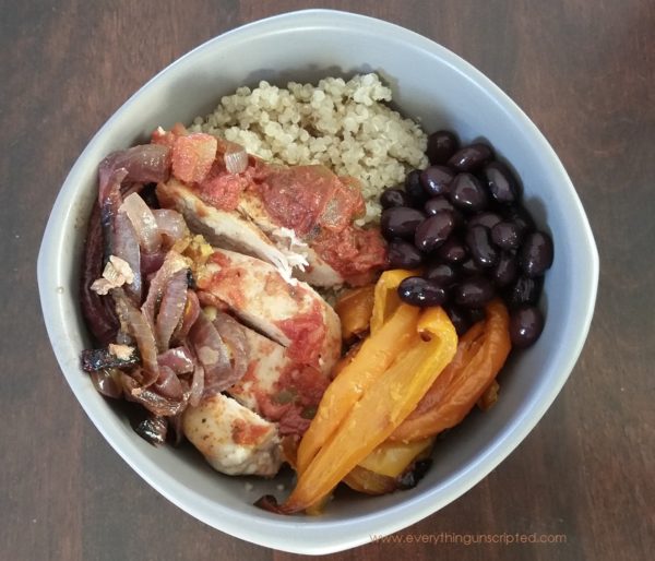 - Roasted Veggies, Black Beans, Quinoa & Salsa Chicken