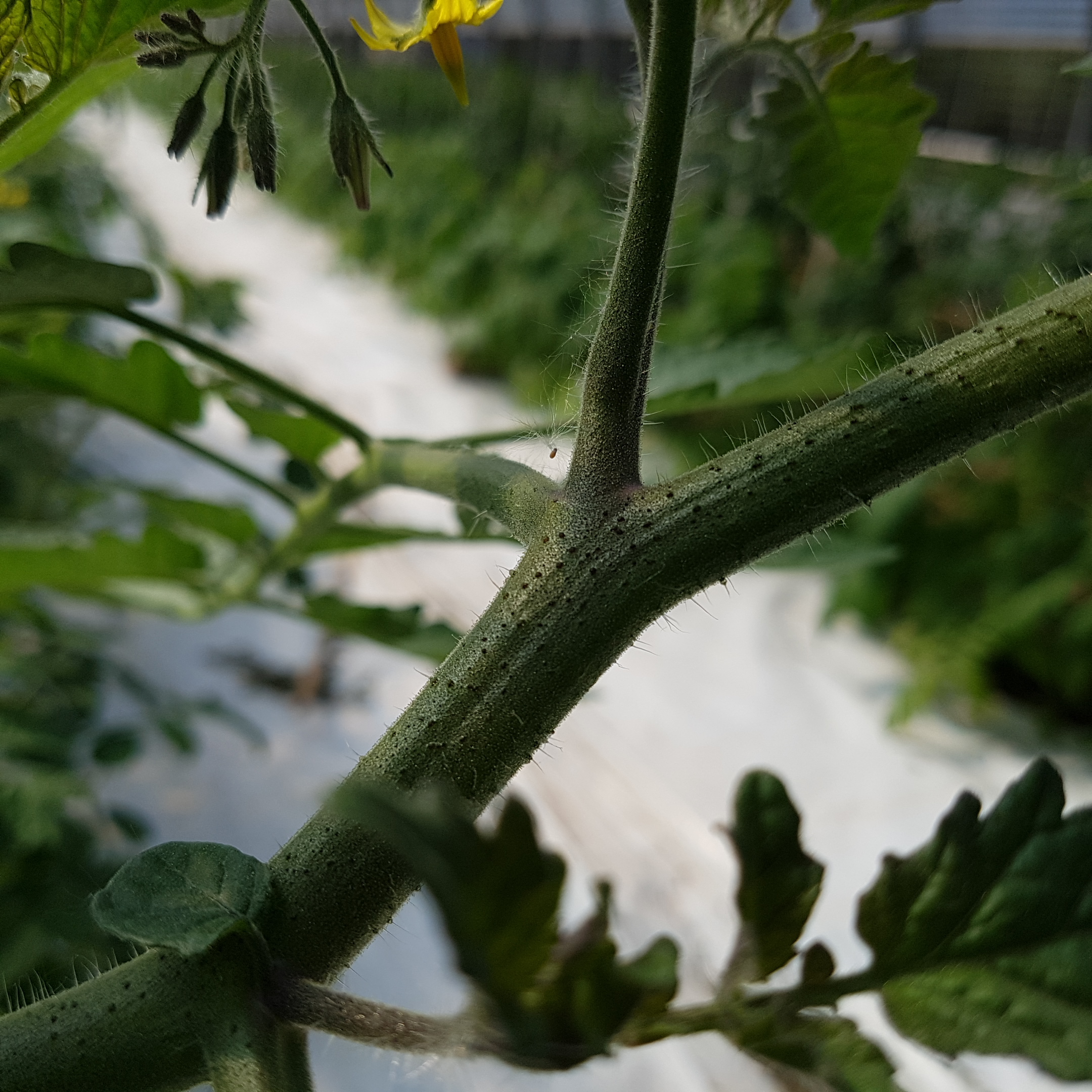 - All the plants are now double headed. Meaning 2 stems are growing and being supported. This is done when the branch below the first cluster of tomatoes is removed. (See video clip for details)