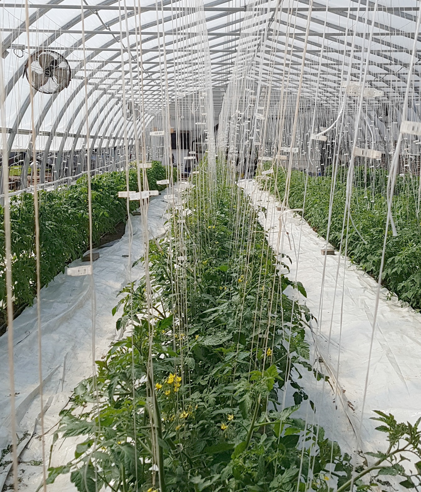 - The white plastic ground cover slows the evaporation process, directs light to the underside of the plants and reduces weeds.